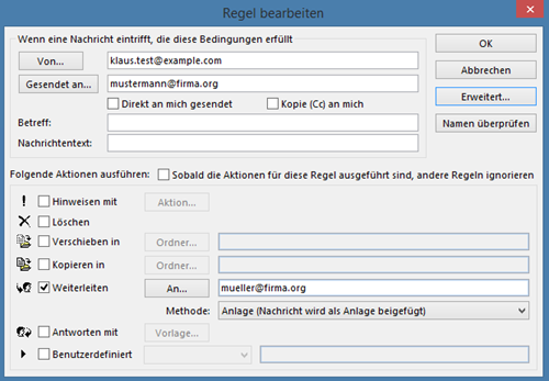 Über "Regeln..." können Sie besondere Aktionen in Abhängigkeit von Empfänger, Absender oder weiteren Eigenschaften automatisch durchführen lassen. Wenn Sie zum Beispiel auf eine wichtige Nachricht von einem Geschäftspartner warten, können Sie hierüber diese automatisch an eine Urlaubsvertretung weiterleiten lassen.