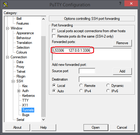 - Geben Sie dort für Source port einen Port ein, der auf Ihren lokalen Rechner nicht belegt ist, z.B. 53306