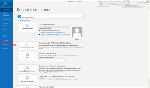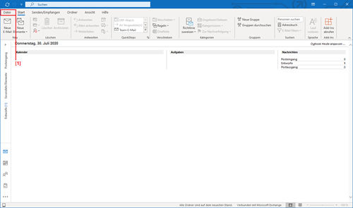 Öffnen Sie Outlook und klicken oben links auf [1] Datei, um weitere Einstellungsmöglichkeiten anzuzeigen: