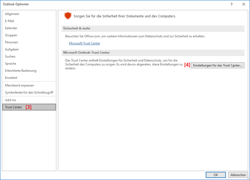 Ein neues Fenster (Outlook-Optionen) öffnet sich. Navigieren Sie im Seitenmenu zu [3] Trust Center und öffnen Sie dann die [4] Einstellungen für das Trust Center: