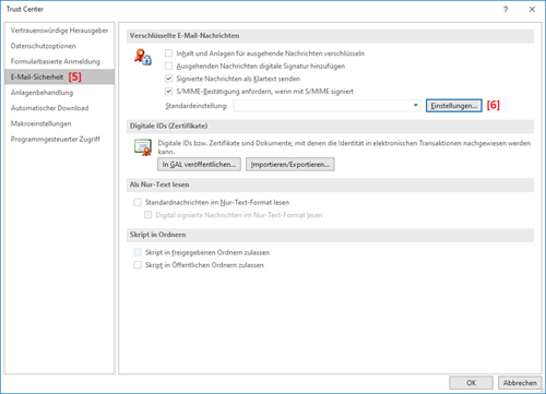 Gehen Sie im linken Seitenmenu zu [5] E-Mail-Sicherheit. Haben Sie Ihr S/MIME-Zertifikat wie in den Vorbereitungen empfohlen, in den Zertifikatspeicher importiert, dann klicken Sie rechts unter Verschlüsselte E-Mail-Nachrichten auf [6] Einstellungen. Falls nicht, importieren Sie jetzt Ihr Zertifikat mit der Schatfläche "Importieren/Exportieren" im Bereich Digitale IDs (Zertfikate) und fahren anschließend mit [6] Einstellungen fort: