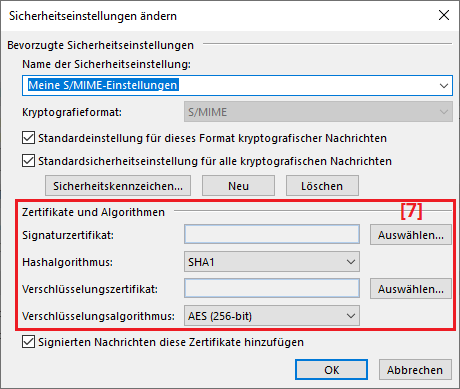 Ein neues Fenster (Sicherheitseinstellungen ändern) öffnet sich. Wenn Sie Ihr S/MIME-Zertifikat in den Windows-Zertifikatspeicher importiert haben, sollten die Felder im Bereich [7] Zertifikate und Algorithmen mit Ihrem Zertifikat vorbelegt sein. Falls nicht - oder falls ein falsches Zertifikat ermittelt wurde - wählen Sie mit Auswählen Ihr Zertifikat als Signaturzertifikat und Verschlüsselungszertifikat aus und bestätigen Sie mit OK: