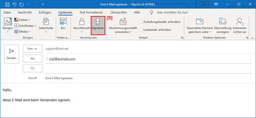 Erstellen Sie eine neue E-Mail und gehen Sie oben im Menu auf den Reiter Optionen. Haben Sie die Option zum automatischen Signieren ausgewählt, ist die Schaltfläche [9] Signieren automatisch aktiv. Andernfalls können Sie mit einem Klick auf diese Schaltfläche eine ausgehende E-Mail signieren: