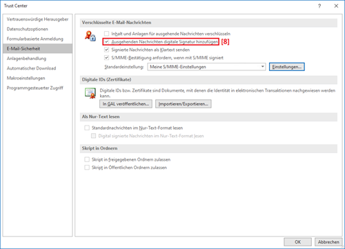 Sie gelangen nun zurück zum Trust Center. Wenn Sie möchten, dass ausgehende Nachrichten automatisch signiert werden, dann aktivieren Sie die Option [8] Ausgehende Nachrichten digitale Signatur hinzufügen. Bestätigen Sie mit OK: