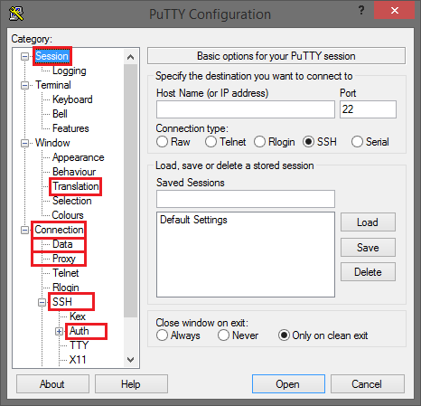 In den nachfolgenden Schritten passen Sie Ihre PuTTY-Konfiguration so an, wie in den Abbildungen aufgezeigt. Die rot umrandeten Werte und Optionen müssen Sie übernehmen.