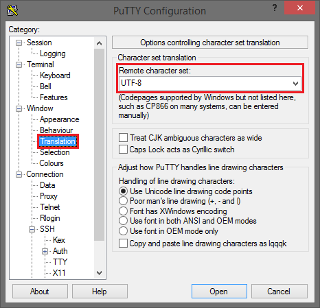 In der Kategorie Window -> Translation stellen Sie das Remote character set auf UTF-8.