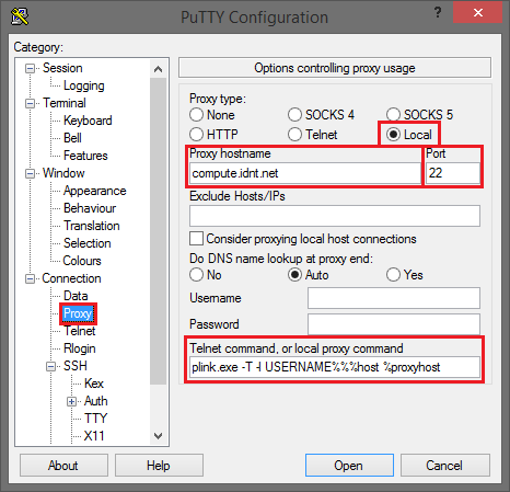 In der Kategorie Connection -> Proxy stellen Sie den Proxy type auf Local und tragen als Proxy hostname compute.idnt.net sowie Port 22 ein. In das Feld Telnet command geben Sie folgendes ein: