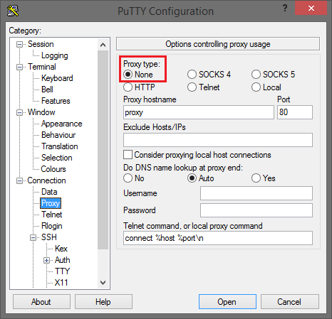 Stellen Sie in der Kategorie Connection -> Proxy den Wert für Proxy type auf None.