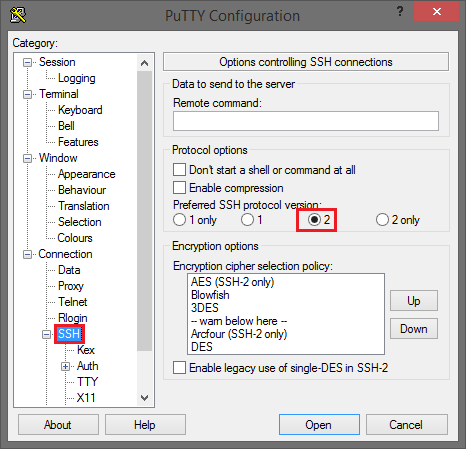 In der Kategorie Connection -> SSH wählen Sie für Preferred SSH protocol version den Wert 2 aus.