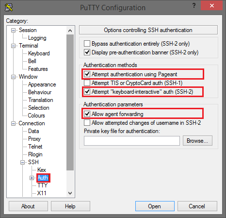 In der Kategorie Connection -> SSH -> Auth setzen Sie ein Häkchen jeweils für: