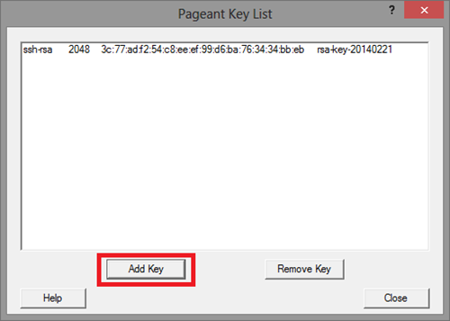 Starten Sie Pageant, klicken Sie auf den Button Add Key und wählen Sie Ihren SSH Private Key aus. Wenn Sie Ihren Schlüssel mit einem Kennwort gesichert haben, werden Sie nun aufgefordert, dieses einzugeben.